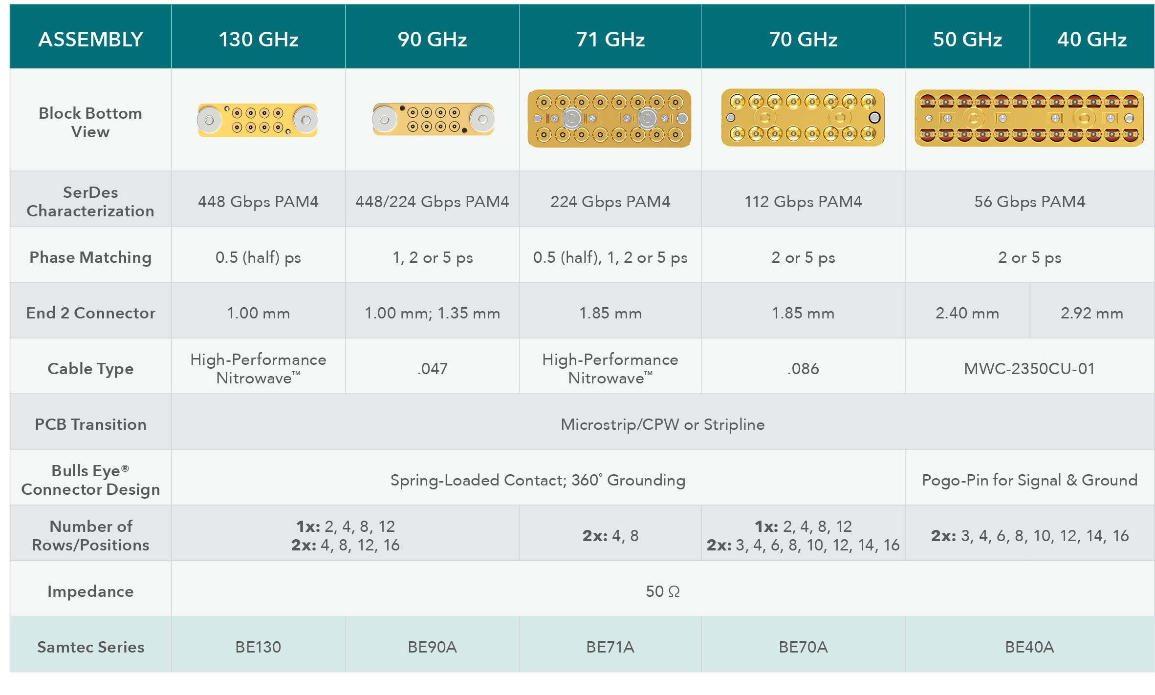 A variety of footprint and position densities are available supporting test requirements up to 448 Gbps. Phase-matching is available at 0.5, 1, 2, and 5 picoseconds (cable dependent).